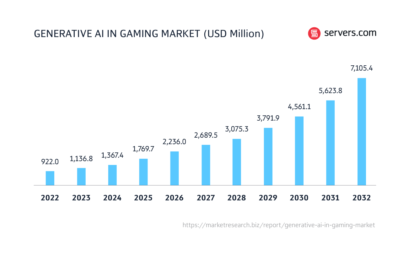 Let’s start with the market size. In 2022, the global market for generative AI in gaming was worth $922 million. That number is expected to grow to $7.1 billion in the next ten years.