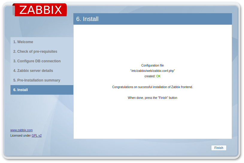 During step 6, we get the message that Zabbix has been successfully installed, and we can finish the installation.