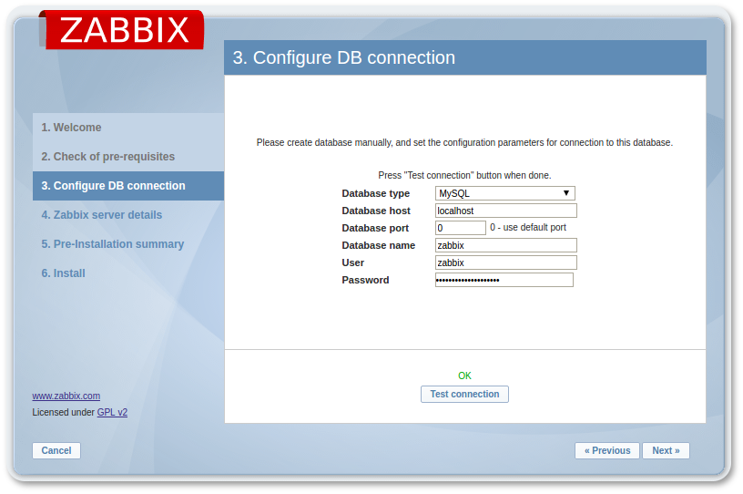 All values must be in the "OK" state. Then, enter the MySQL connection parameters: