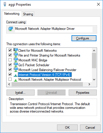 To make changes to IPv4 settings, open "Control Panel > Network and Internet > Network and Sharing Center > Change adapter settings" window. Right-click on the interface named "aggi" and select "Properties" to view network interface settings.